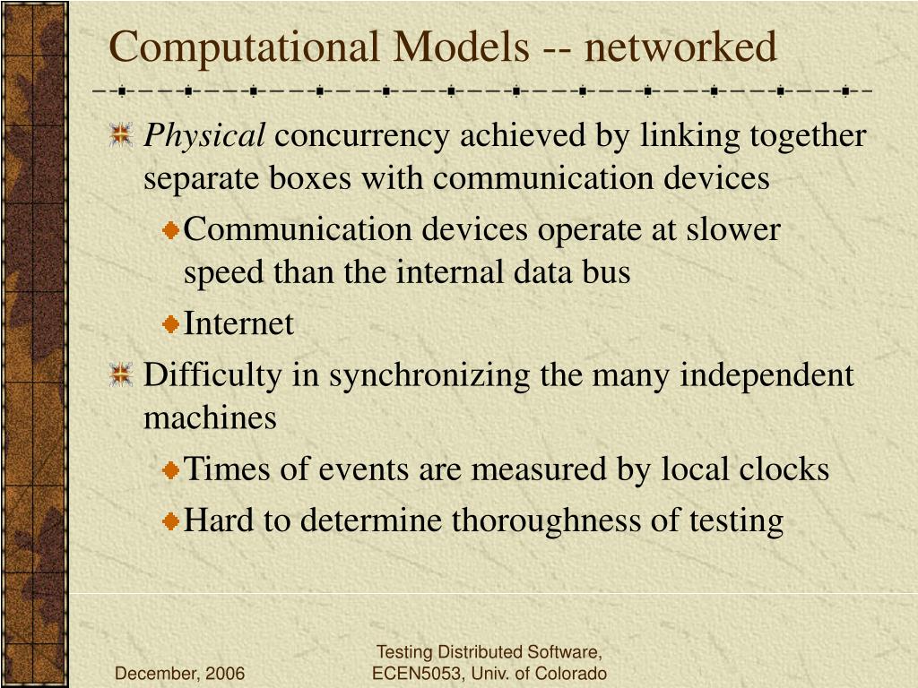 Computational Models -- networked • Physical concurrency achieved by linking together separate boxes with communication devices • Communication devices operate at slower speed than the internal data bus • Internet • Difficulty in synchronizing the many independent machines • Times of events are measured by local clocks • Hard to determine thoroughness of testing Testing Distributed Software, ECEN5053, Univ. of Colorado