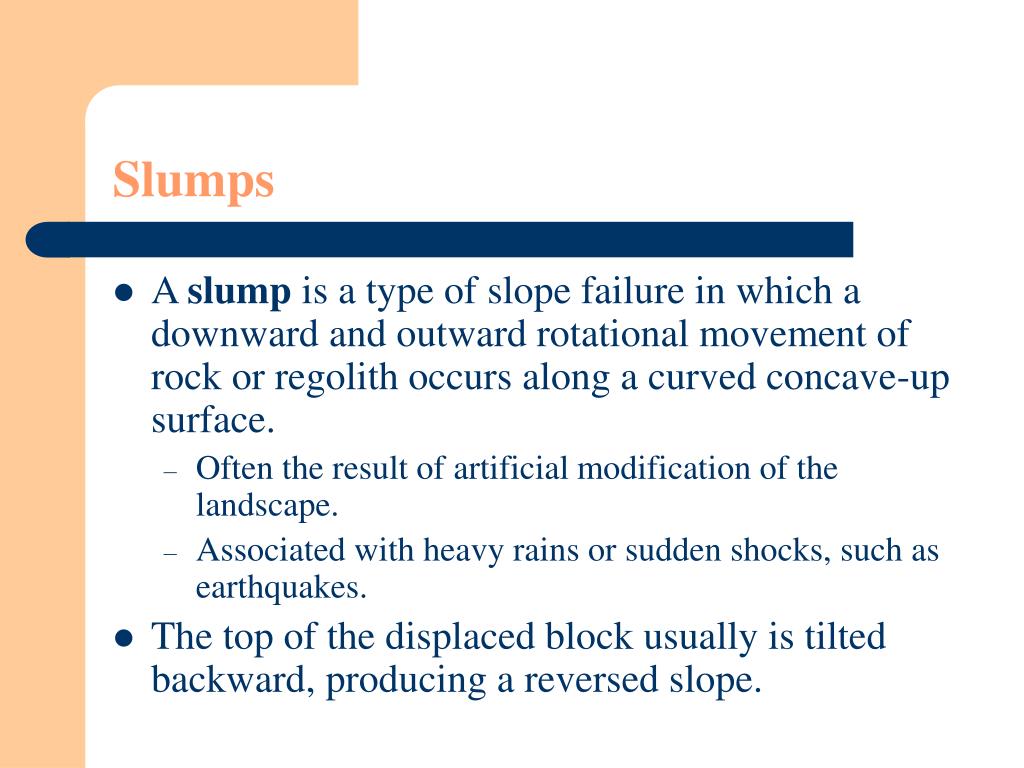 Slumps • A slump is a type of slope failure in which a downward and outward rotational movement of rock or regolith occurs along a curved concave-up surface. • Often the result of artificial modification of the landscape. • Associated with heavy rains or sudden shocks, such as earthquakes. • The top of the displaced block usually is tilted backward, producing a reversed slope.