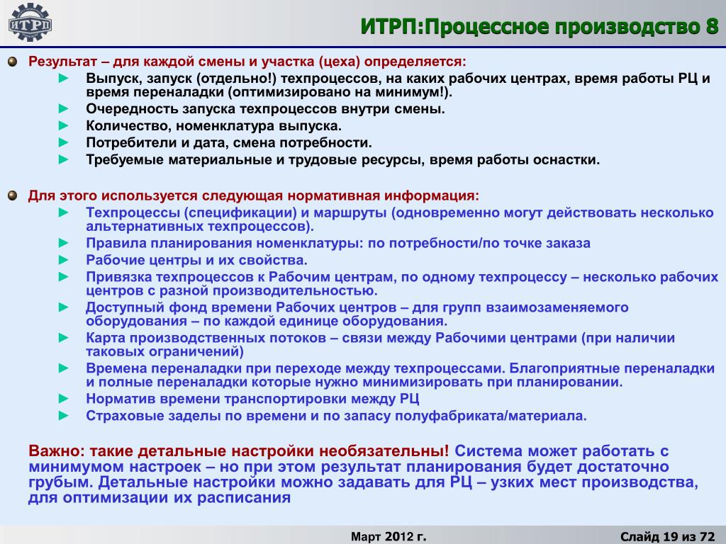 Для этого используется следующая нормативная информация: Техпроцессы (спецификации) и маршруты (одновременно могут действовать несколько альтернативных техпроцессов). Правила планирования номенклатуры: по потребности/по точке заказа Рабочие центры и их свойства. Привязка техпроцессов к Рабочим центрам, по одному техпроцессу – несколько рабочих центров с разной производительностью. Доступныйфонд времени Рабочих центров – для групп взаимозаменяемого оборудования – по каждой единице оборудования. Карта производственных потоков – связи между Рабочими центрами (при наличии таковых ограничений) Времена переналадки при переходе между техпроцессами. Благоприятные переналадки и полные переналадки которые нужно минимизировать при планировании. Норматив времени транспортировки между РЦ Страховые заделы по времени и по запасу полуфабриката/материала. Важно: такие детальные настройки необязательны! Система может работать с минимумом настроек – но при этом результат планирования будет достаточно грубым. Детальные настройки можно задавать для РЦ – узких мест производства, для оптимизации их расписания • Результат – для каждой смены и участка (цеха) определяется: • Выпуск, запуск (отдельно!) техпроцессов, на каких рабочих центрах, время работы РЦ и время переналадки (оптимизировано на минимум!). • Очередность запуска техпроцессов внутри смены. • Количество, номенклатура выпуска. • Потребители и дата, смена потребности. • Требуемые материальные и трудовые ресурсы, время работы оснастки.