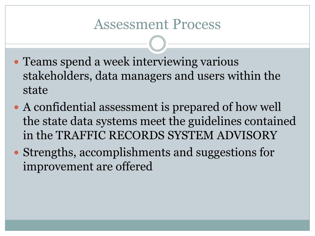 Assessment Process Teams spend a week interviewing various stakeholders, data managers and users within the state A confidential assessment is prepared of how well the state data systems meet the guidelines contained in the TRAFFIC RECORDS SYSTEM ADVISORY Strengths, accomplishments and suggestions for improvement are offered