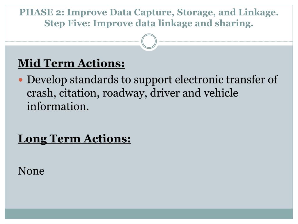 PHASE 2: Improve Data Capture, Storage, and Linkage.Step Five: Improve data linkage and sharing. Mid Term Actions: Develop standards to support electronic transfer of crash, citation, roadway, driver and vehicle information. Long Term Actions: None