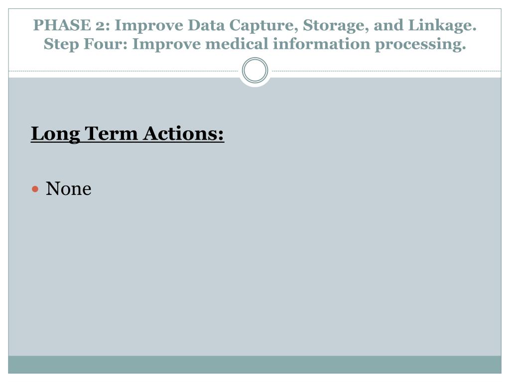 PHASE 2: Improve Data Capture, Storage, and Linkage.Step Four: Improve medical information processing. Long Term Actions: None