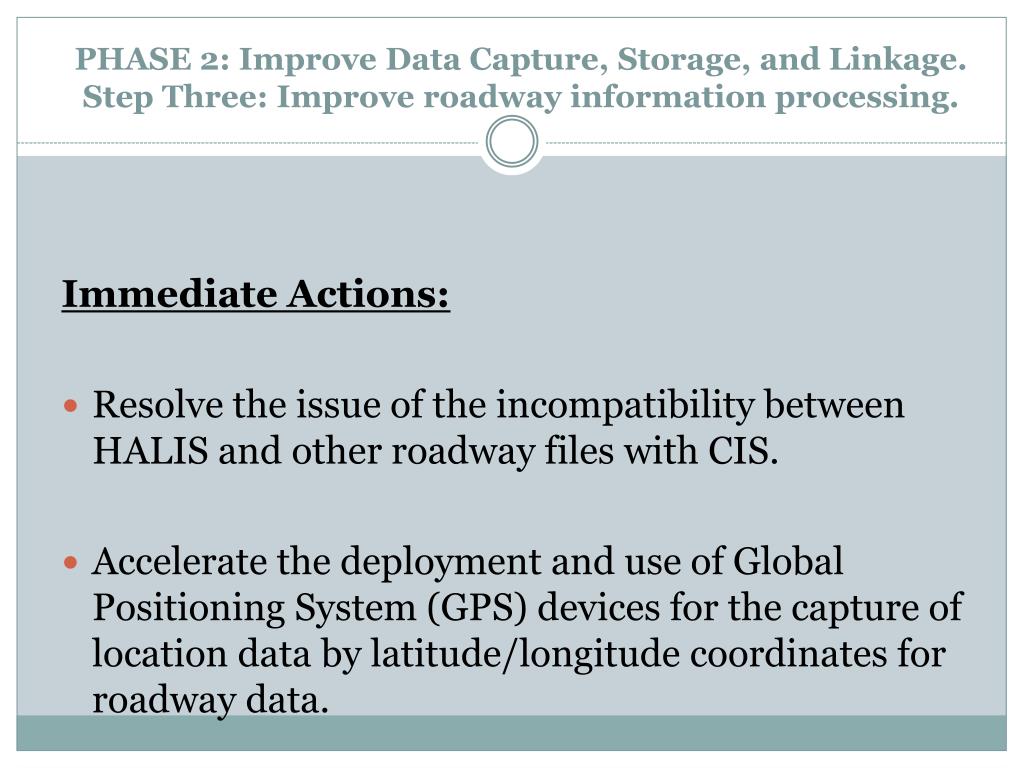 PHASE 2: Improve Data Capture, Storage, and Linkage.Step Three: Improve roadway information processing. Immediate Actions: Resolve the issue of the incompatibility between HALIS and other roadway files with CIS. Accelerate the deployment and use of Global Positioning System (GPS) devices for the capture of location data by latitude/longitude coordinates for roadway data.