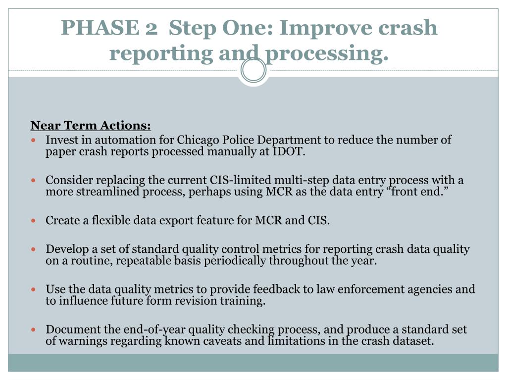 PHASE 2 Step One: Improve crash reporting and processing. Near Term Actions: Invest in automation for Chicago Police Department to reduce the number of paper crash reports processed manually at IDOT. Consider replacing the current CIS-limited multi-step data entry process with a more streamlined process, perhaps using MCR as the data entry “front end.” Create a flexible data export feature for MCR and CIS. Develop a set of standard quality control metrics for reporting crash data quality on a routine, repeatable basis periodically throughout the year. Use the data quality metrics to provide feedback to law enforcement agencies and to influence future form revision training. Document the end-of-year quality checking process, and produce a standard set of warnings regarding known caveats and limitations in the crash dataset.