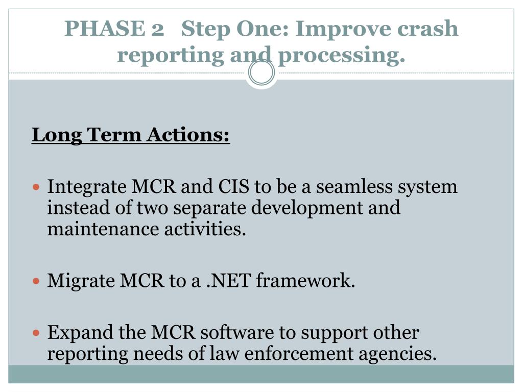 PHASE 2 Step One: Improve crash reporting and processing. Long Term Actions: Integrate MCR and CIS to be a seamless system instead of two separate development and maintenance activities. Migrate MCR to a .NET framework. Expand the MCR software to support other reporting needs of law enforcement agencies.