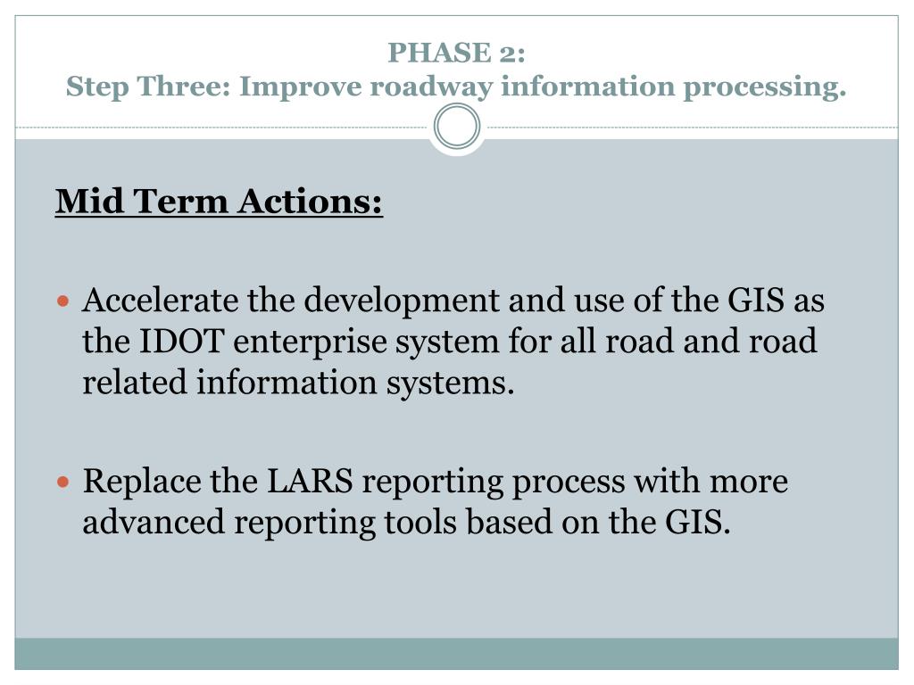 PHASE 2: Step Three: Improve roadway information processing. Mid Term Actions: Accelerate the development and use of the GIS as the IDOT enterprise system for all road and road related information systems. Replace the LARS reporting process with more advanced reporting tools based on the GIS.