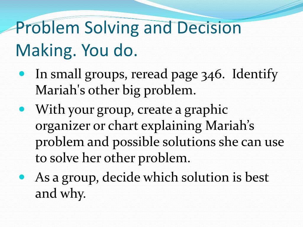 Problem Solving and Decision Making. You do. • In small groups, reread page 346. Identify Mariah's other big problem. • With your group, create a graphic organizer or chart explaining Mariah’s problem and possible solutions she can use to solve her other problem. • As a group, decide which solution is best and why.