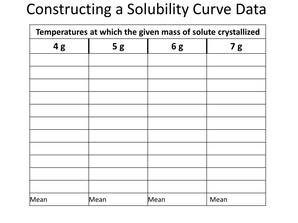 As you come in… Have out C.2 questions and worksheet. Objectives: 1. I know the relationship between temperature and the amount of substance that an dissolve. 2. I can describe a method for collecting data in the laboratory to create a solubility curve. 3. I can identify some of the possible errors in the lab and predict how these errors would affect the data. Catalyst: What is the solubility of potassium nitrate in 80 g of water at 60°? 50 g KCl is dissolved in 100 g of water that is at 80°. What would happen if the amount of KCl was doubled?