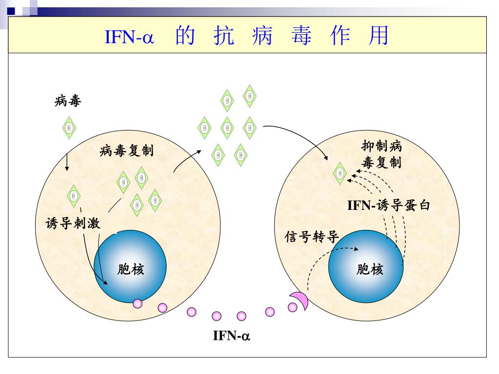 IFN-a 的 抗 病 毒 作 用 病毒 抑制病 毒复制 病毒复制 IFN-诱导蛋白 诱导刺激 信号转导 胞核 胞核 IFN-a
