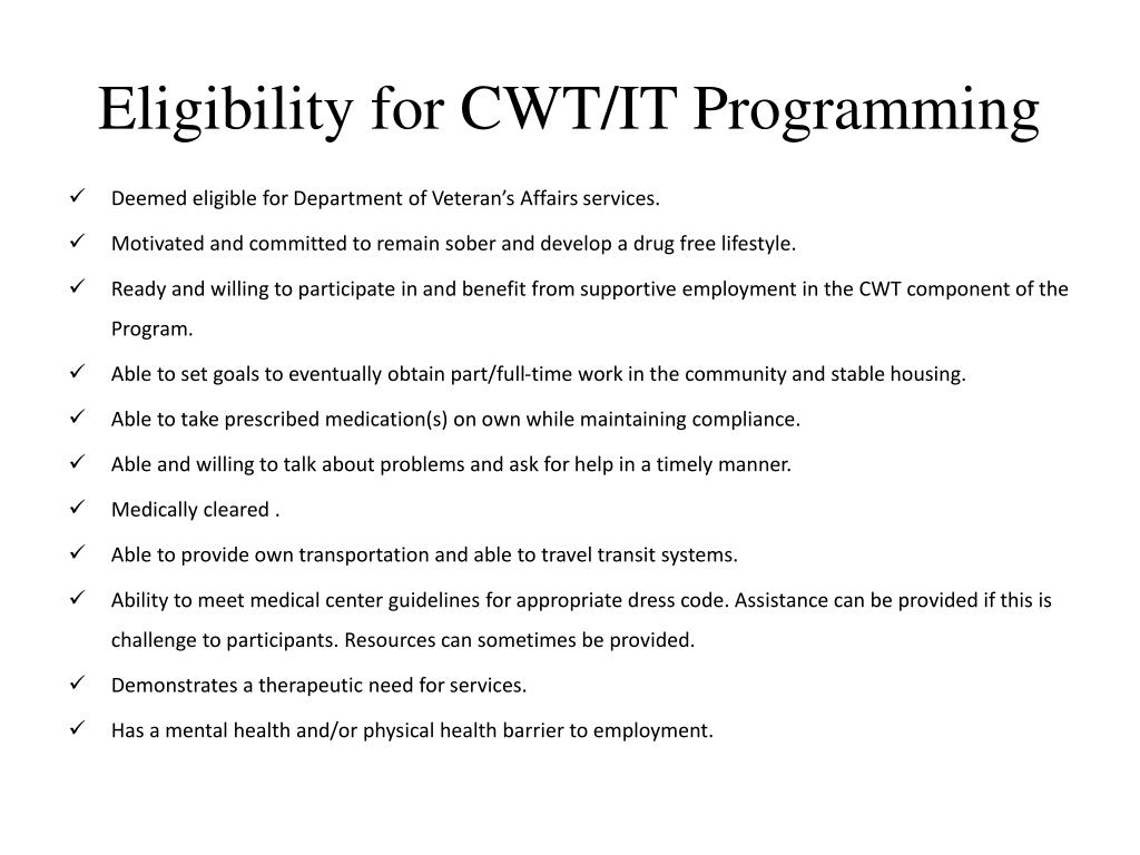 Eligibility for CWT/IT Programming • Deemed eligible for Department of Veteran’s Affairs services. • Motivated and committed to remain sober and develop a drug free lifestyle. • Ready and willing to participate in and benefit from supportive employment in the CWT component of the Program. • Able to set goals to eventually obtain part/full-time work in the community and stable housing. • Able to take prescribed medication(s) on own while maintaining compliance. • Able and willing to talk about problems and ask for help in a timely manner. • Medically cleared . • Able to provide own transportation and able to travel transit systems. • Ability to meet medical center guidelines for appropriate dress code. Assistance can be provided if this is challenge to participants. Resources can sometimes be provided. • Demonstrates a therapeutic need for services. • Has a mental health and/or physical health barrier to employment.