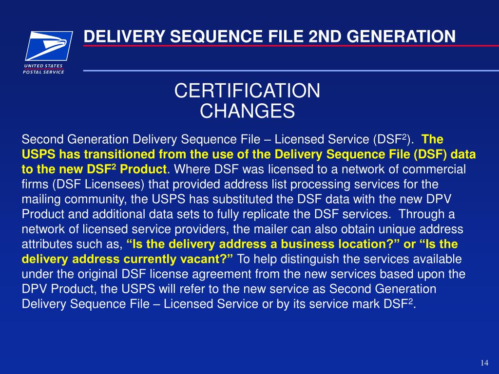 CERTIFICATIONCHANGES Second Generation Delivery Sequence File – Licensed Service (DSF2). The USPS has transitioned from the use of the Delivery Sequence File (DSF) data to the new DSF2 Product. Where DSF was licensed to a network of commercial firms (DSF Licensees) that provided address list processing services for the mailing community, the USPS has substituted the DSF data with the new DPV Product and additional data sets to fully replicate the DSF services. Through a network of licensed service providers, the mailer can also obtain unique address attributes such as, “Is the delivery address a business location?” or “Is the delivery address currently vacant?” To help distinguish the services available under the original DSF license agreement from the new services based upon the DPV Product, the USPS will refer to the new service as Second Generation Delivery Sequence File – Licensed Service or by its service mark DSF2.