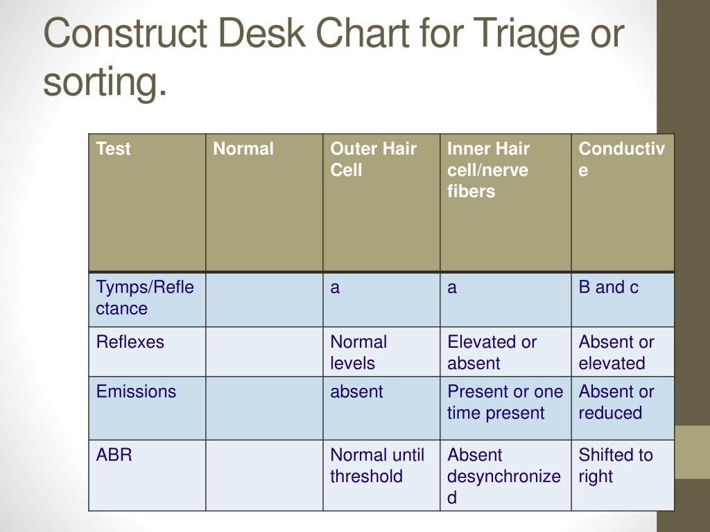 To avoid missing these patients, or confusing them with CAPD patients, we recommend the following triage with each new patient as follows: • Tympanometry • Middle Ear Muscle Reflexes • Otoacoustic Emissions. • See blank Chart …