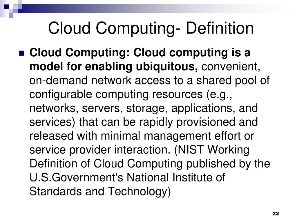 Cloud Computing- Definition Cloud Computing: Cloud computing is a model for enabling ubiquitous, convenient, on-demand network access to a shared pool of configurable computing resources (e.g., networks, servers, storage, applications, and services) that can be rapidly provisioned and released with minimal management effort or service provider interaction. (NIST Working Definition of Cloud Computing published by the U.S.Government's National Institute of Standards and Technology)