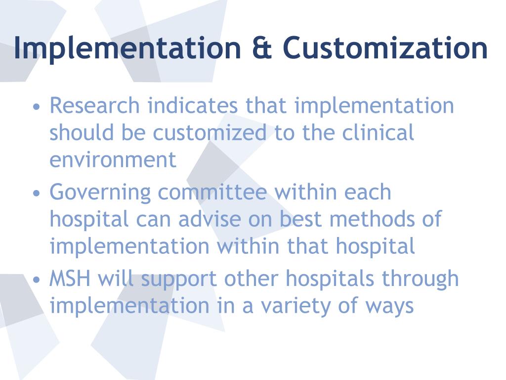 Implementation & Customization • Research indicates that implementation should be customized to the clinical environment • Governing committee within each hospital can advise on best methods of implementation within that hospital • MSH will support other hospitals through implementation in a variety of ways
