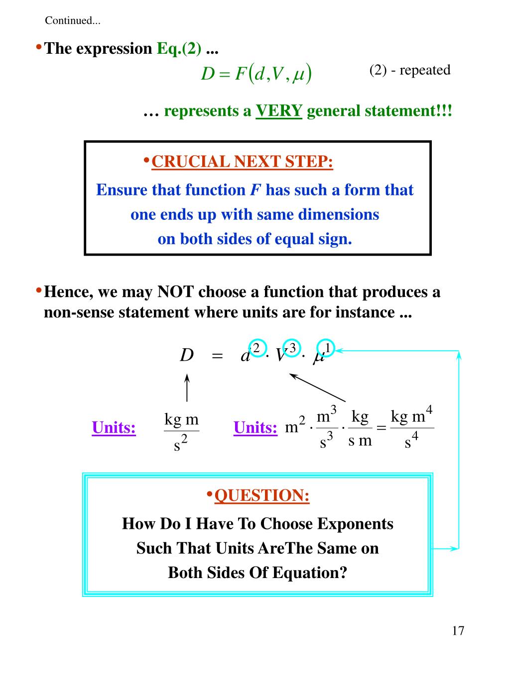 The expression Eq.(2) ... (2) - repeated Continued... … represents a VERY general statement!!! • CRUCIAL NEXT STEP: Ensure that function F has such a form that one ends up with same dimensions on both sides of equal sign. • Hence, we may NOT choose a function that produces a non-sense statement where units are for instance ... Units: Units: • QUESTION: How Do I Have To Choose Exponents Such That Units AreThe Same on Both Sides Of Equation?