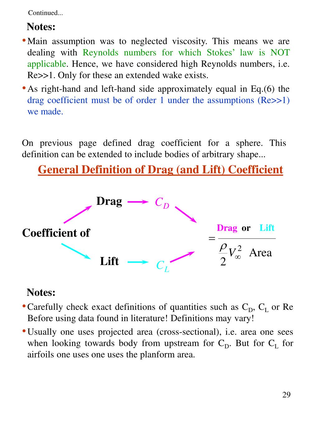 Notes: • Main assumption was to neglected viscosity. This means we are dealing with Reynolds numbers for which Stokes’ law is NOT applicable. Hence, we have considered high Reynolds numbers, i.e. Re>>1. Only for these an extended wake exists. • As right-hand and left-hand side approximately equal in Eq.(6) the drag coefficient must be of order 1 under the assumptions (Re>>1) we made. Continued... On previous page defined drag coefficient for a sphere. This definition can be extended to include bodies of arbitrary shape... General Definition of Drag (and Lift) Coefficient Drag Drag or Lift Coefficient of Lift Notes: • Carefully check exact definitions of quantities such as CD, CL or Re Before using data found in literature! Definitions may vary! • Usually one uses projected area (cross-sectional), i.e. area one sees when looking towards body from upstream for CD. But for CL for airfoils one uses one uses the planform area.