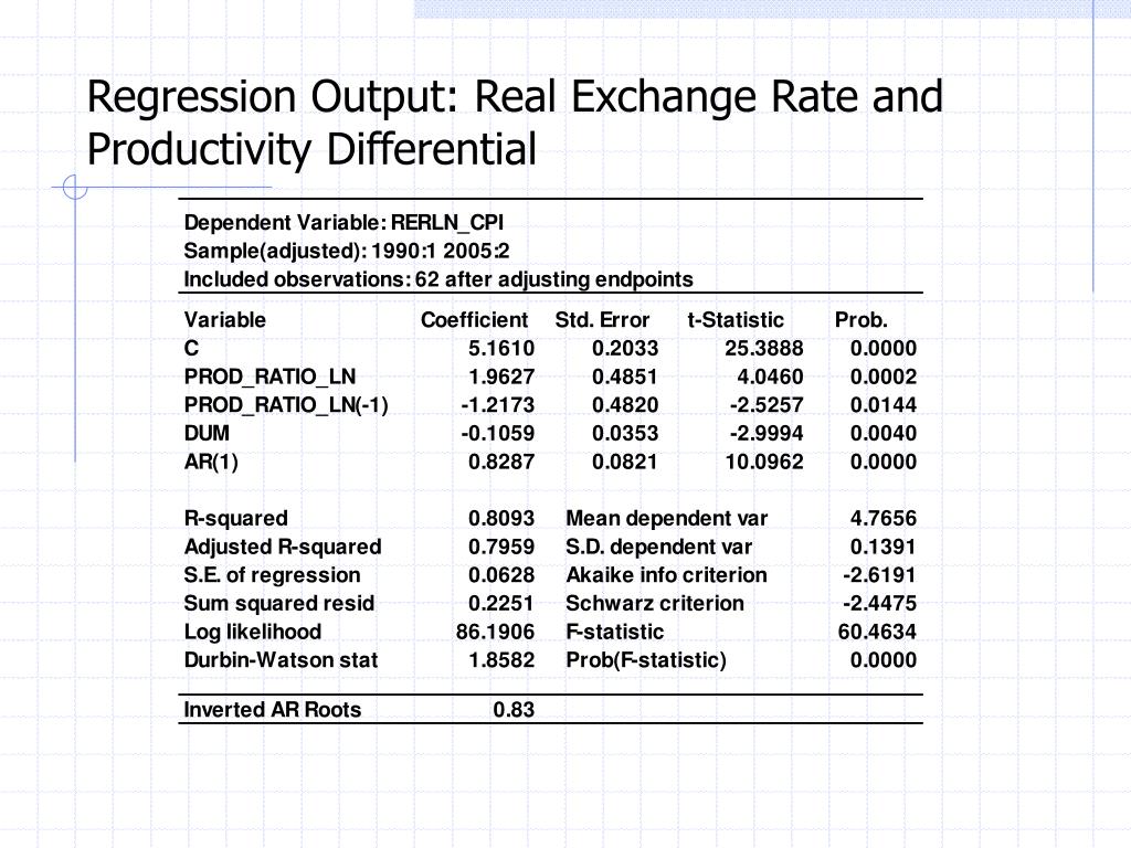 RER Regression Inferences • The sum of the current and lagged productivity ratio coefficients is 0.746, thus over the long run a 1% Δ change in the productivity differential → a 0.746% Δ in the RER. • For the whole sample period (1990Q1 through 2005Q2), the Δ in productivity differential is 30.7%, and the change in RER is 42.6%, implying that 53.8% of the Δ in the RER can be attributed to the Δ in productivity differential. • The residual series from this regression is taken as an RER series that is cleared from effects of relative productivity changes, and thus encompasses all other drivers of the real exchange rate except for the productivity differential variable. • The purpose is to gain insight into the impact of RER Δs on the current account deficit in the absence and in the presence of a Balassa-Samuelson effect.