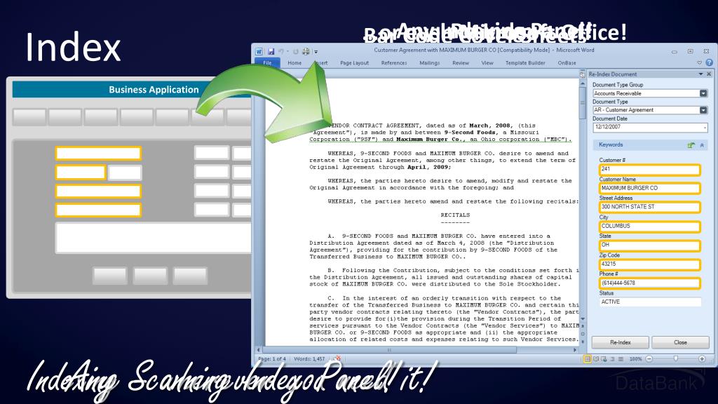 Any Indexing Panel! Re-Index …or even Microsoft Office! Index Bar Code Cover Sheets Business Application Any Scanning Index Panel! Indexing – wherever you need it!