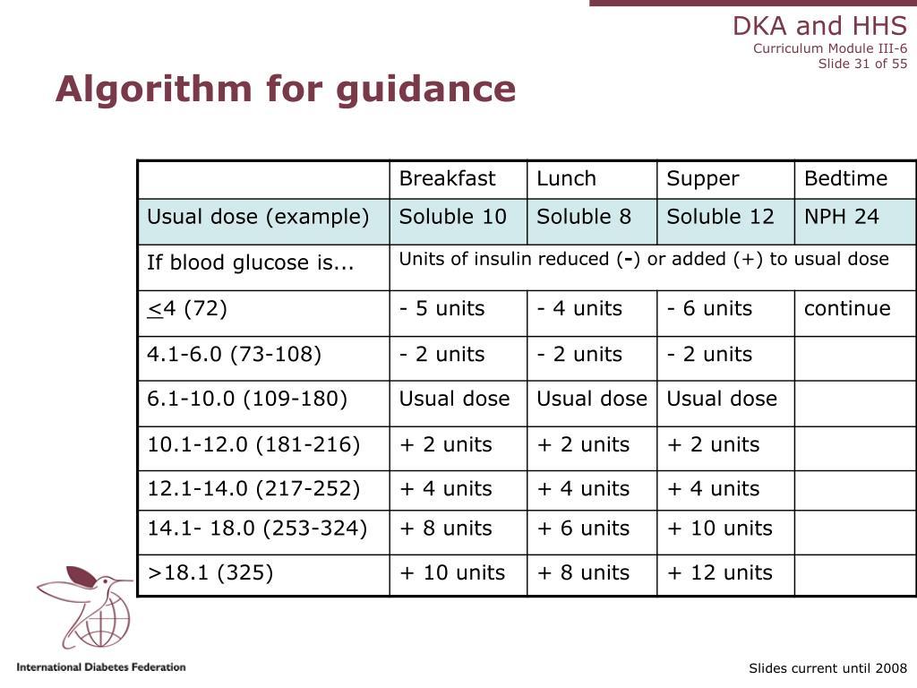 Blood glucose >15mmol/L (270 mg/dL), ketones present Usual insulin PLUS Short- or rapid-acting insulin 10-20% of total daily dose every 2-4 hours(short-acting insulin) or every 1-2 hours (rapid-acting insulin) Glucose tests every 1-2 hours Eg: blood glucose 20 mmol (360 mg/dL) normal doses insulin Rapid acting =10 + 8 + 12 NPH = 22 Total = 52 units/day Give 20% ~10 units of rapid acting Insulin correction doses Give additional doses every 1 to 4 hours until blood glucose <12mmol/L (216mg/dL) and ketones reduced (urine or blood <1.0mmol/L) Slides current until 2008