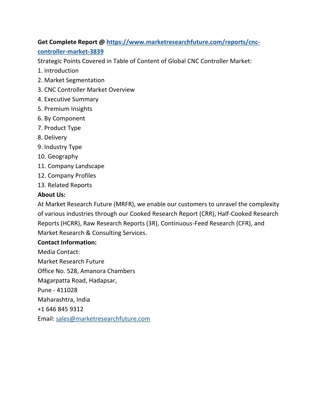 Get Complete Report @ https://www.marketresearchfuture.com/reports/cnc- controller-market-3839 Strategic Points Covered in Table of Content of Global CNC Controller Market: 1. Introduction 2. Market Segmentation 3. CNC ControllerMarket Overview 4. Executive Summary 5. Premium Insights 6. By Component 7. Product Type 8. Delivery 9. Industry Type 10. Geography 11. Company Landscape 12. Company Profiles 13. Related Reports About Us: At Market Research Future (MRFR), we enable our customers to unravel the complexity of various industries through our Cooked Research Report (CRR), Half-Cooked Research Reports (HCRR), Raw Research Reports (3R), Continuous-Feed Research (CFR), and Market Research & Consulting Services. Contact Information: Media Contact: Market Research Future Office No. 528, Amanora Chambers Magarpatta Road, Hadapsar, Pune - 411028 Maharashtra, India +1 646 845 9312 Email: sales@marketresearchfuture.com