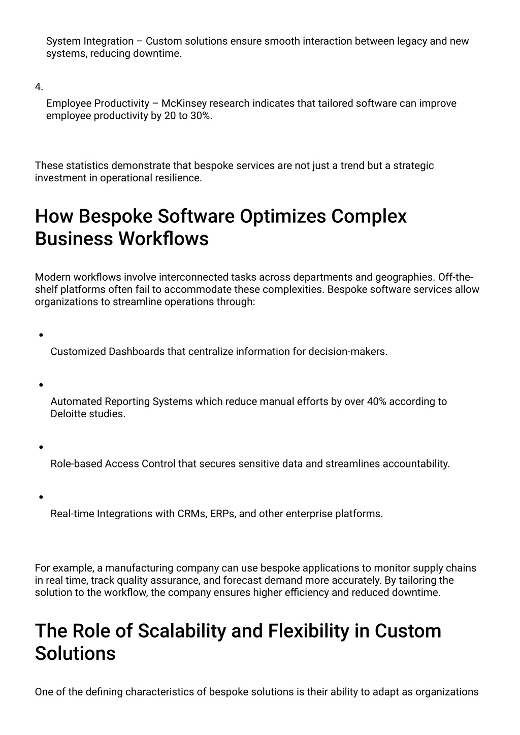 System Integration – Custom solutions ensure smooth interaction between legacy and new systems, reducing downtime. 4. Employee Productivity – McKinsey research indicates that tailored software can improve employee productivity by 20 to 30%. These statistics demonstrate that bespoke services are not just a trend but a strategic investment in operational resilience. How Bespoke Software Optimizes Complex Business Workflows Modern workflows involve interconnected tasks across departments and geographies. Off-the- shelf platforms often fail to accommodate these complexities. Bespoke software services allow organizations to streamline operations through: Customized Dashboards that centralize information for decision-makers. Automated Reporting Systems which reduce manual efforts by over 40% according to Deloitte studies. Role-based Access Control that secures sensitive data and streamlines accountability. Real-time Integrations with CRMs, ERPs, and other enterprise platforms. For example, a manufacturing company can use bespoke applications to monitor supply chains in real time, track quality assurance, and forecast demand more accurately. By tailoring the solution to the workflow, the company ensures higher efficiency and reduced downtime. The Role of Scalability and Flexibility in Custom Solutions One of the defining characteristics of bespoke solutions is their ability to adapt as organizations