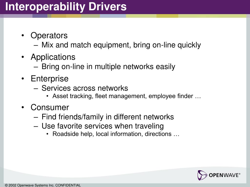 Interoperability Drivers • Operators • Mix and match equipment, bring on-line quickly • Applications • Bring on-line in multiple networks easily • Enterprise • Services across networks • Asset tracking, fleet management, employee finder … • Consumer • Find friends/family in different networks • Use favorite services when traveling • Roadside help, local information, directions …