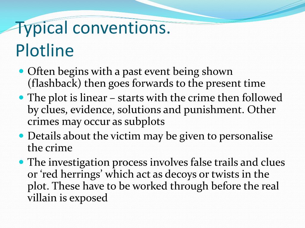 Typical conventions.Plotline • Often begins with a past event being shown (flashback) then goes forwards to the present time • The plot is linear – starts with the crime then followed by clues, evidence, solutions and punishment. Other crimes may occur as subplots • Details about the victim may be given to personalise the crime • The investigation process involves false trails and clues or ‘red herrings’ which act as decoys or twists in the plot. These have to be worked through before the real villain is exposed