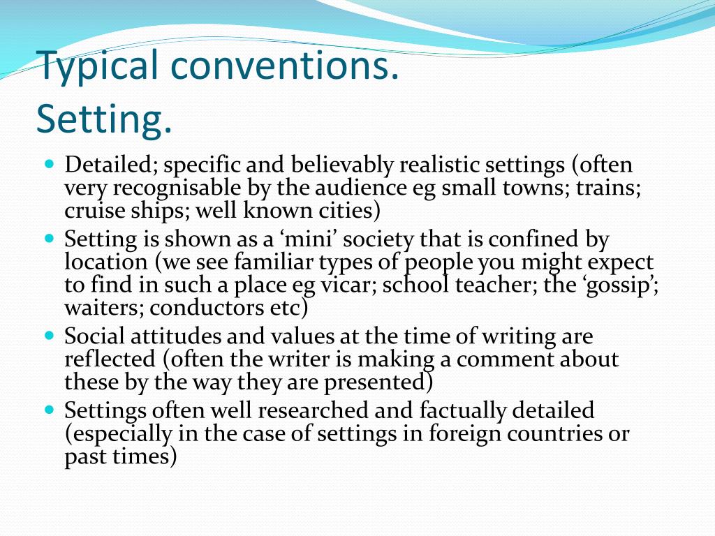 Typical conventions.Setting. • Detailed; specific and believably realistic settings (often very recognisable by the audience eg small towns; trains; cruise ships; well known cities) • Setting is shown as a ‘mini’ society that is confined by location (we see familiar types of people you might expect to find in such a place eg vicar; school teacher; the ‘gossip’; waiters; conductors etc) • Social attitudes and values at the time of writing are reflected (often the writer is making a comment about these by the way they are presented) • Settings often well researched and factually detailed (especially in the case of settings in foreign countries or past times)