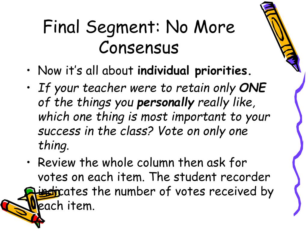 Final Segment: No More Consensus • Now it’s all about individual priorities. • If your teacher were to retain only ONE of the things you personally really like, which one thing is most important to your success in the class? Vote on only one thing. • Review the whole column then ask for votes on each item. The student recorder indicates the number of votes received by each item.