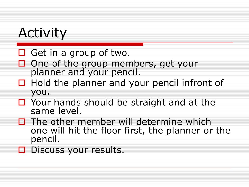 Activity • Get in a group of two. • One of the group members, get your planner and your pencil. • Hold the planner and your pencil infront of you. • Your hands should be straight and at the same level. • The other member will determine which one will hit the floor first, the planner or the pencil. • Discuss your results.