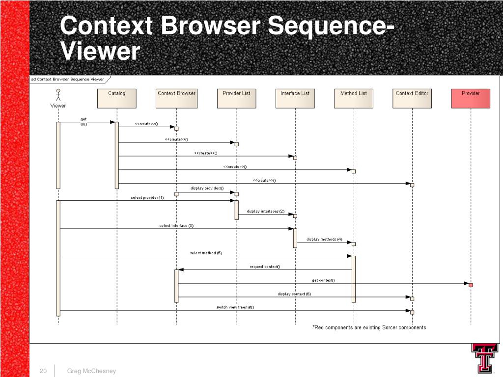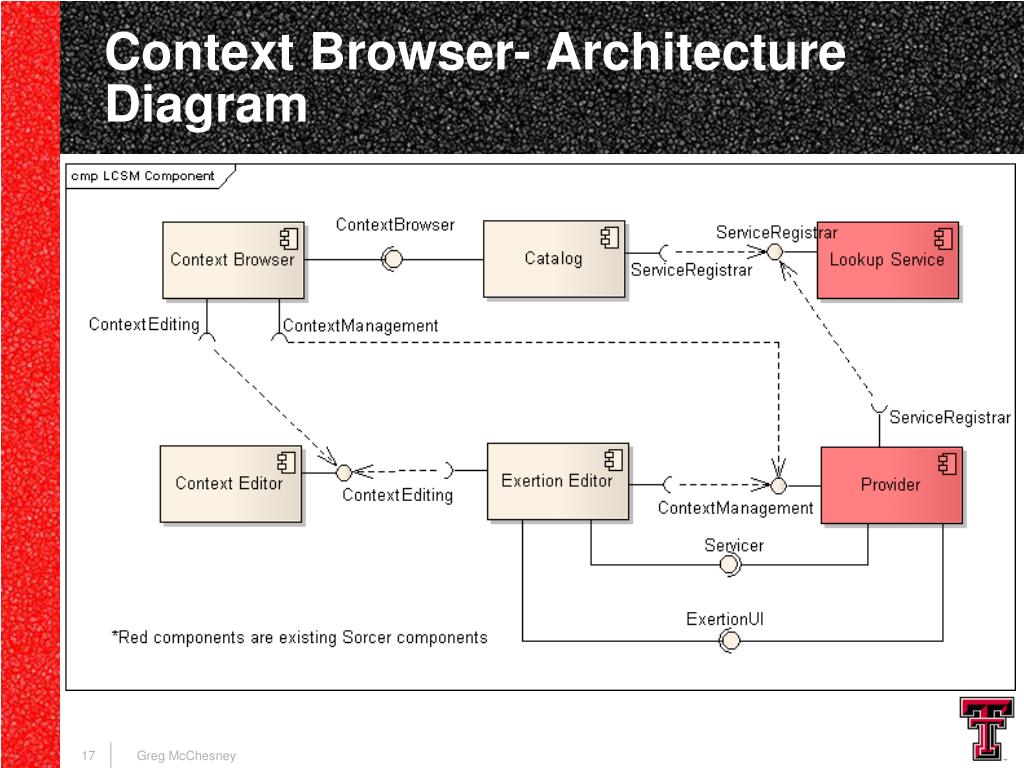 Feasibility Study • Create the Context Browser provider to test Life-Cycle methods • Get Context • Add Context • Update Context • Delete Context • Utilize Arithmetic provider to demonstrate the power of the Exertion Editor. • Address new provider development with integrated user interfaces Greg McChesney