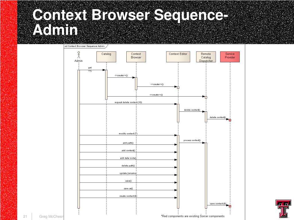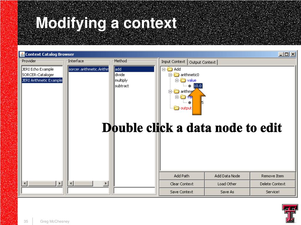 Overview of Contexts • A service context is a basic data structure in SOOA • Used for communication between provider and requestor (a data exchange contract) • A service context depends on the provider and the method being executed • Data specification of hierarchical attributes the method will require • Stored in a tree like format of path/value Greg McChesney