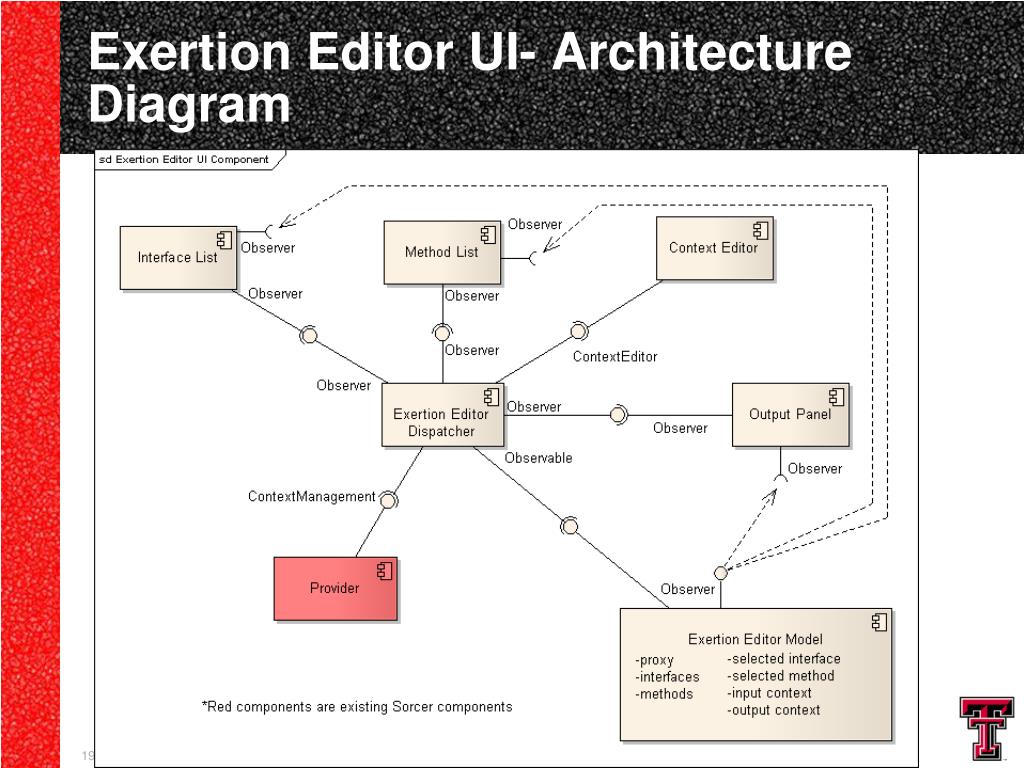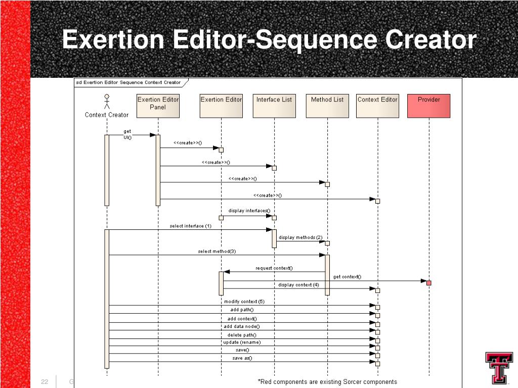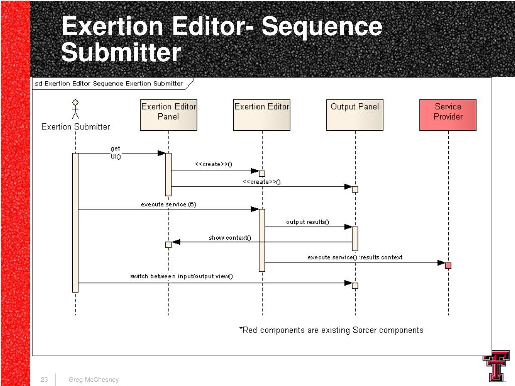 Technical Architecture Context Browser Exertion Editor Utilities and Templates Web Exertion Based Clients Requestor Service UIs Intraportal Extraportal Infrastructure Providers Jobber, Tasker, Spacer, Grider, Caller,Methoder, Cataloger, Notifier, Logger, Reporter, Authenticator, Authorizer, Auditor, Policer, KeyStorer,Surrogater, Persister, FileStorer,SILENUS, FICUS SORCER Core Servicer, ServiceProvider, ServiceProviderBean ExertionDelegate, ServiceAccessor Persistence Provisioning and Activation File Store Exertion Layer J2EE, Jini, Rio, GApp Context Management Greg McChesney