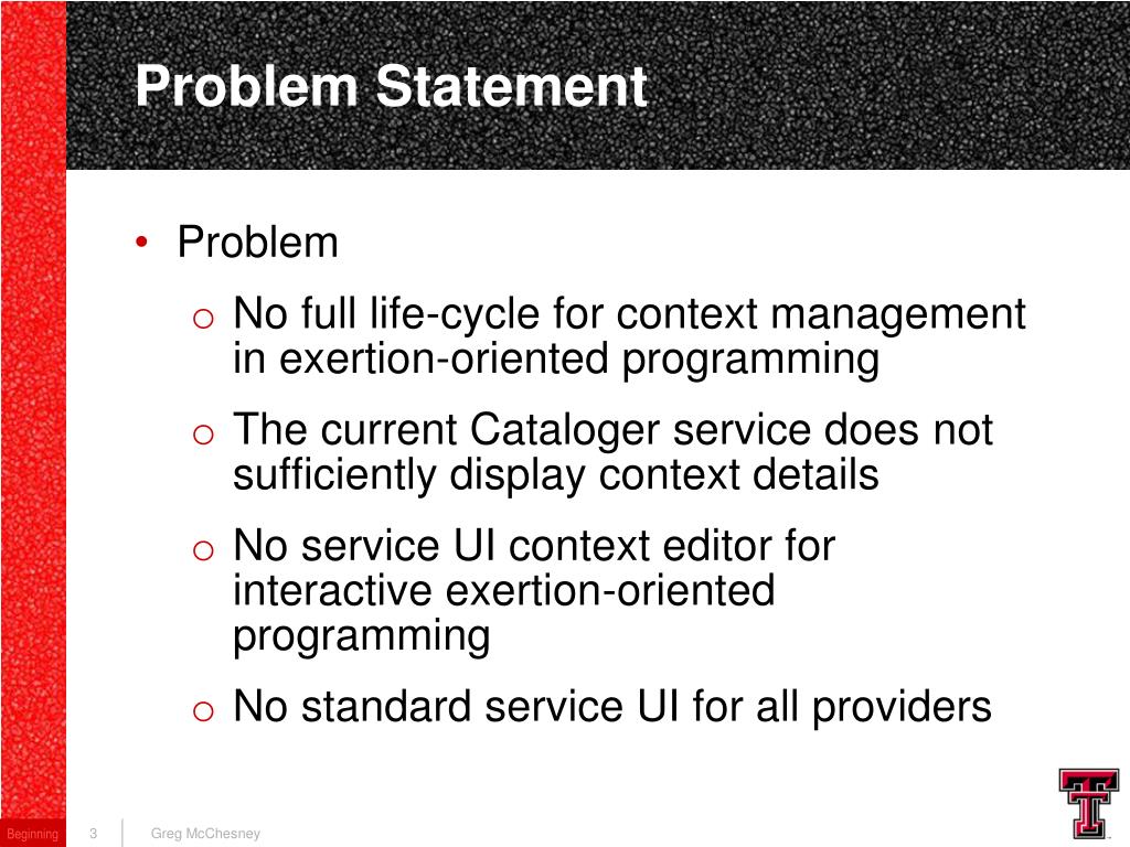 Problem Statement • Problem • No full life-cycle for context management in exertion-oriented programming • The current Cataloger service does not sufficiently display context details • No service UI context editor for interactive exertion-oriented programming • No standard service UI for all providers Greg McChesney Beginning