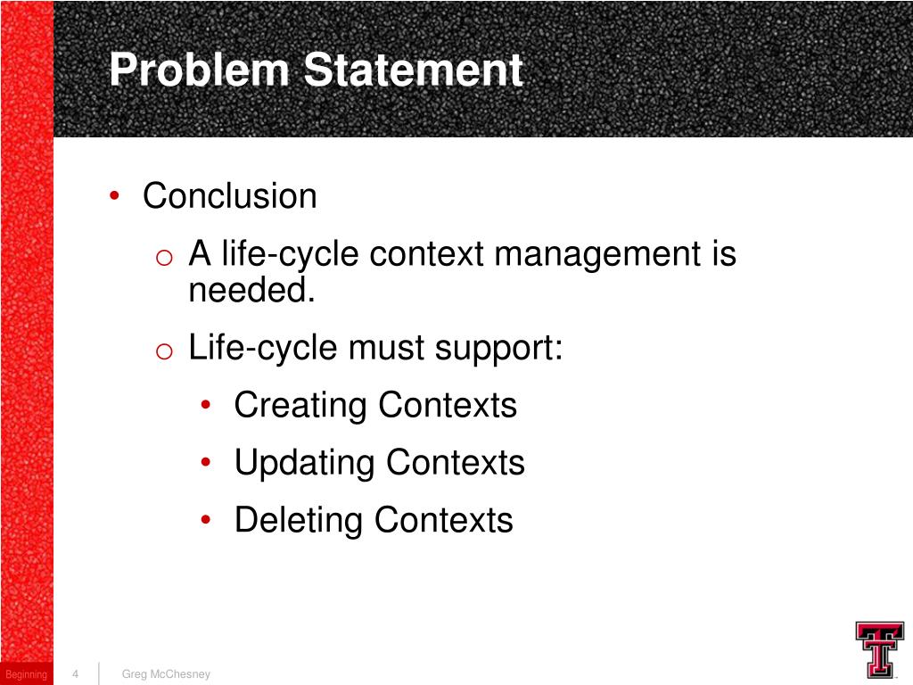 Problem Statement • Conclusion • A life-cycle context management is needed. • Life-cycle must support: • Creating Contexts • Updating Contexts • Deleting Contexts Greg McChesney Beginning