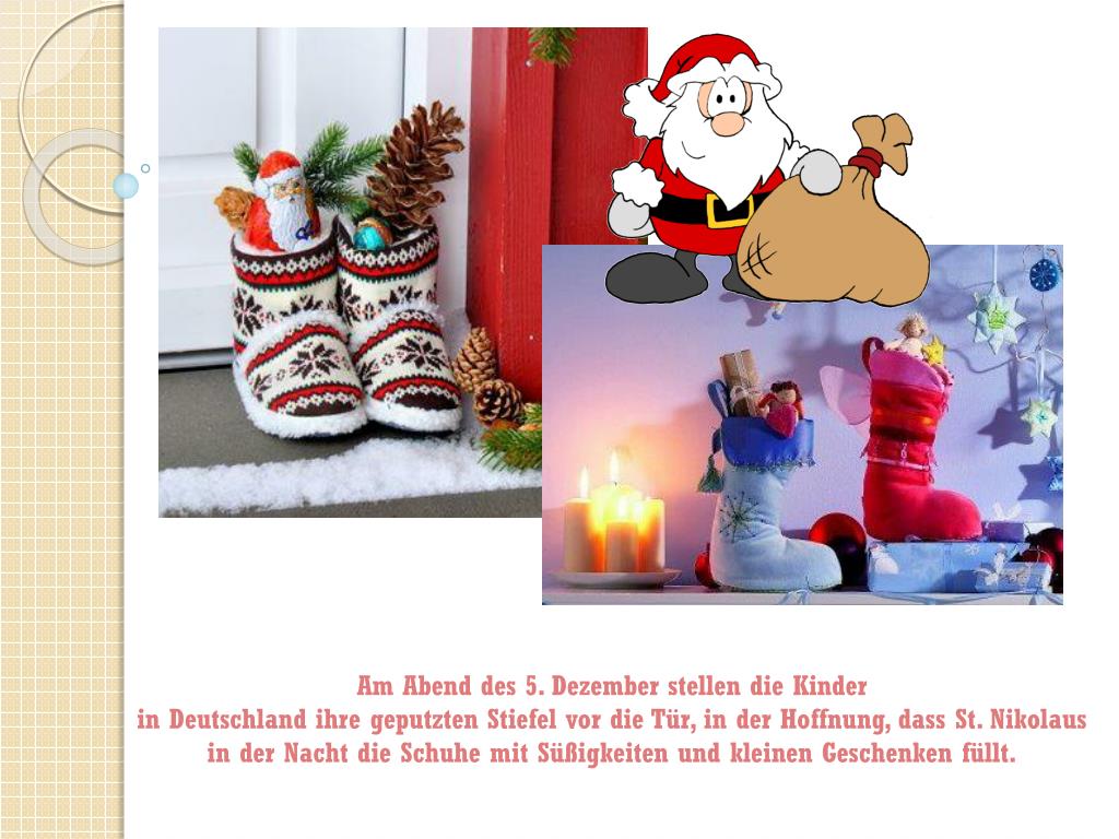 Am Abend des 5. Dezemberstellen die Kinderin Deutschland ihregeputztenStiefelvor die Tür, in derHoffnung, dass St. Nikolaus in derNacht die SchuhemitSüßigkeiten und kleinenGeschenkenfüllt.