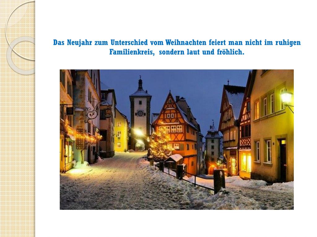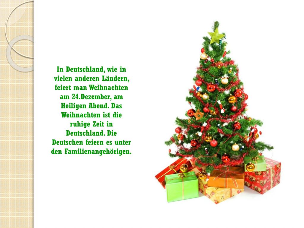In Deutschland, wie in vielenanderenLändern, feiert man Weihnachten am 24.Dezember, am HeiligenAbend. Das Weihnachtenist die ruhigeZeit in Deutschland. Die Deutschenfeiernesunter den Familienangehörigen.
