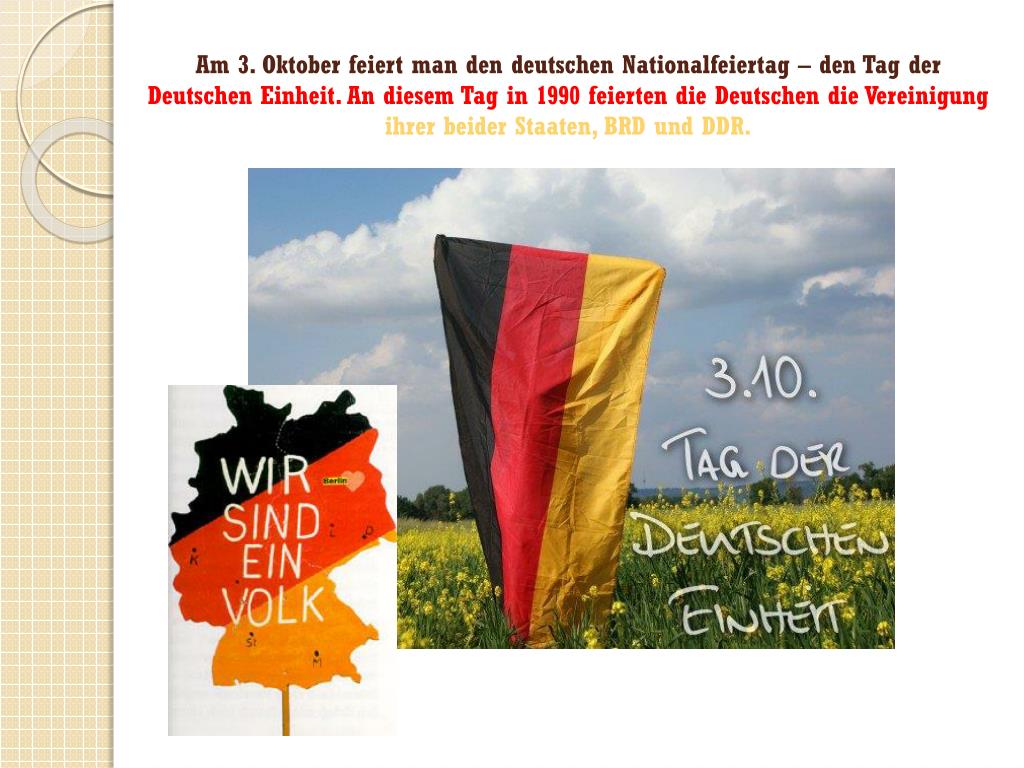 Am 3. Oktoberfeiert man den deutschenNationalfeiertag – den Tag derDeutschenEinheit. An diesem Tag in 1990 feierten die Deutschen die VereinigungihrerbeiderStaaten, BRD und DDR.