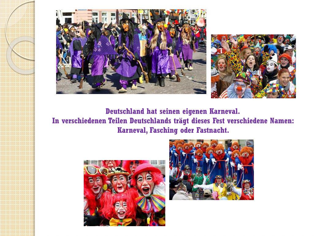 Deutschland hat seineneigenenKarneval.In verschiedenenTeilenDeutschlandsträgt dieses Fest verschiedeneNamen: Karneval, FaschingoderFastnacht.