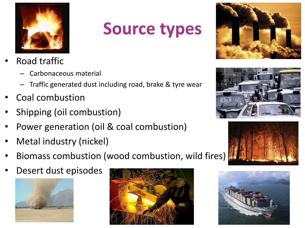 Source types • Road traffic • Carbonaceous material • Traffic generated dust including road, brake & tyre wear • Coal combustion • Shipping (oil combustion) • Power generation (oil & coal combustion) • Metal industry (nickel) • Biomass combustion (wood combustion, wild fires) • Desert dust episodes