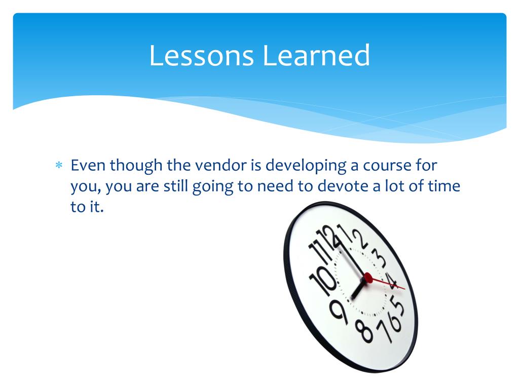 Lessons Learned • Even though the vendor is developing a course for you, you are still going to need to devote a lot of time to it.