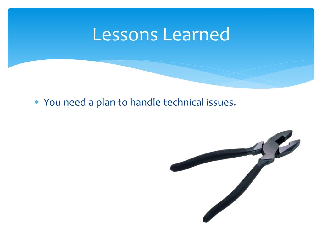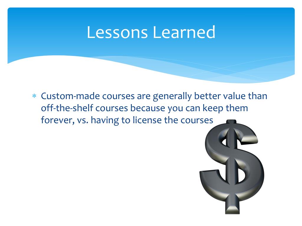 Lessons Learned • Custom-made courses are generally better value than off-the-shelf courses because you can keep them forever, vs. having to license the courses