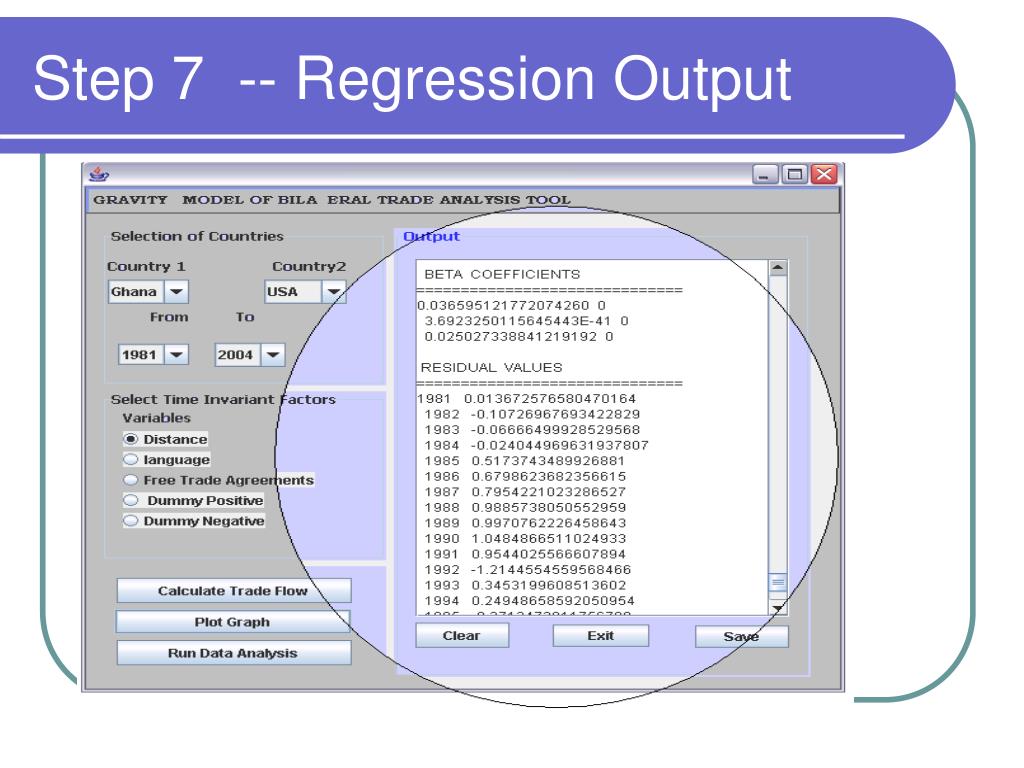 Elements of Output Regression Output When performing regression analysis the following terms are displayed in the Output text field. These values and table can be saved and imported to be used in other programs . • Standard error term • The residual values i.e.. Difference between predicted and actual trade flow values in a table and also the • Correlation coefficients