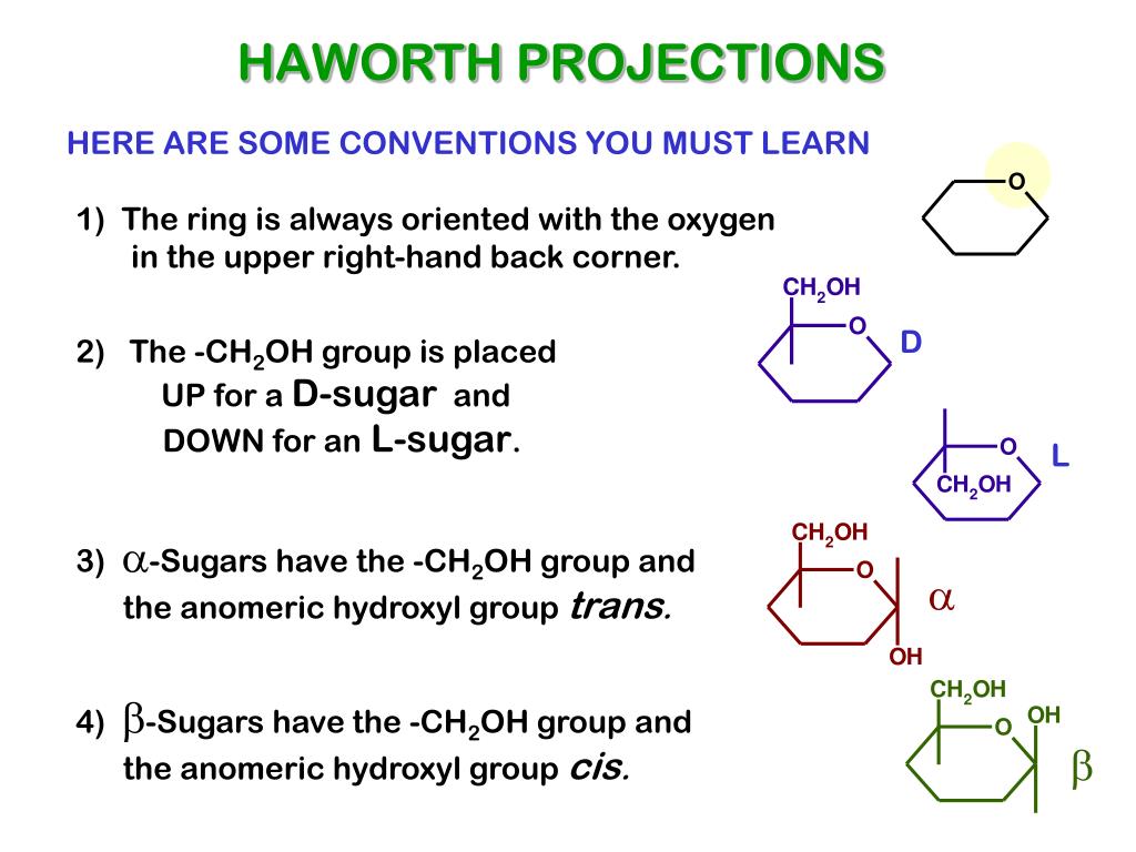HAWORTH PROJECTIONS HERE ARE SOME CONVENTIONS YOU MUST LEARN 1) The ring is always oriented with the oxygen in the upper right-hand back corner. D 2) The -CH2OH group is placed UP for a D-sugar and DOWN for an L-sugar. L 3) a-Sugars have the -CH2OH group and the anomeric hydroxyl group trans. a 4) b-Sugars have the -CH2OH group and the anomeric hydroxyl group cis. b