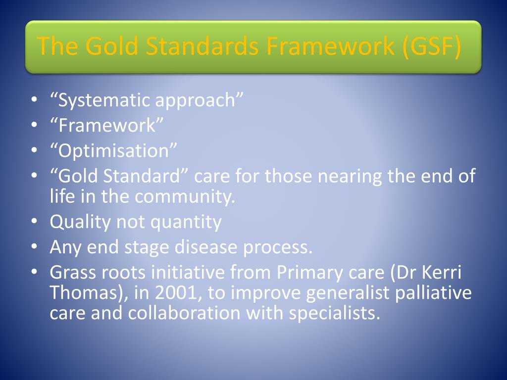 “Systematic approach” • “Framework” • “Optimisation” • “Gold Standard” care for those nearing the end of life in the community. • Quality not quantity • Any end stage disease process. • Grass roots initiative from Primary care (Dr Kerri Thomas), in 2001, to improve generalist palliative care and collaboration with specialists.
