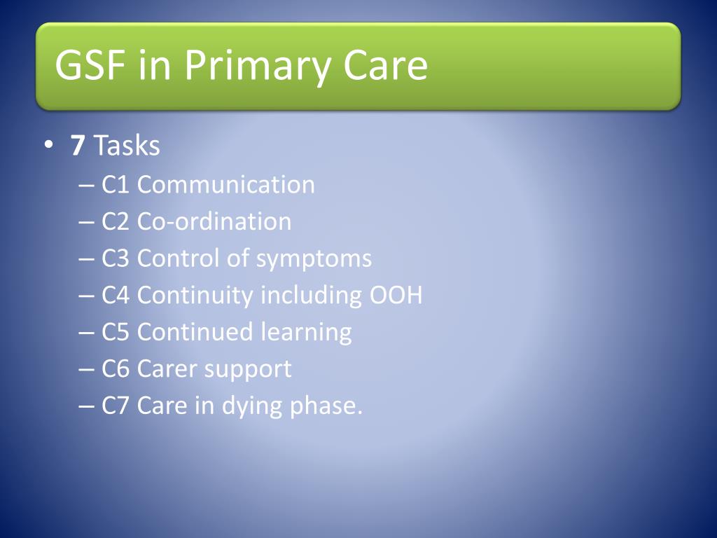 7 Tasks • C1 Communication • C2 Co-ordination • C3 Control of symptoms • C4 Continuity including OOH • C5 Continued learning • C6 Carer support • C7 Care in dying phase.