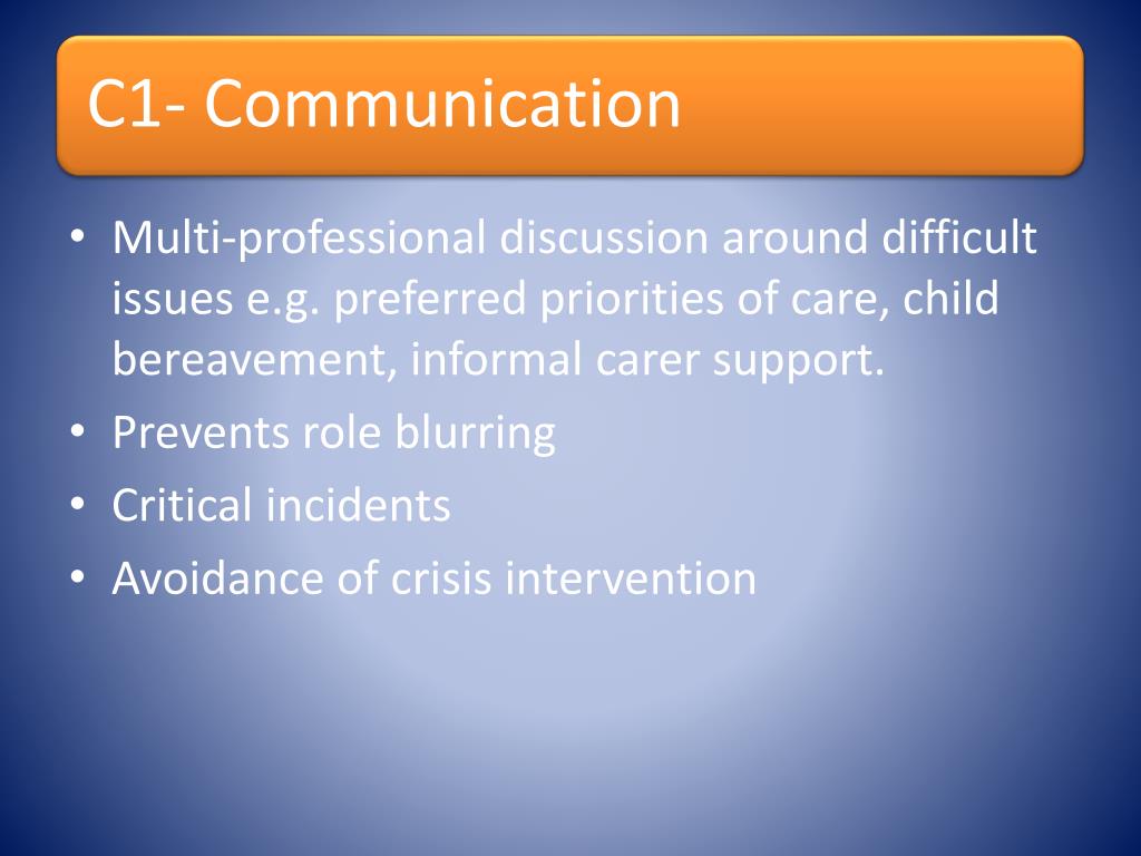 Multi-professional discussion around difficult issues e.g. preferred priorities of care, child bereavement, informal carer support. • Prevents role blurring • Critical incidents • Avoidance of crisis intervention