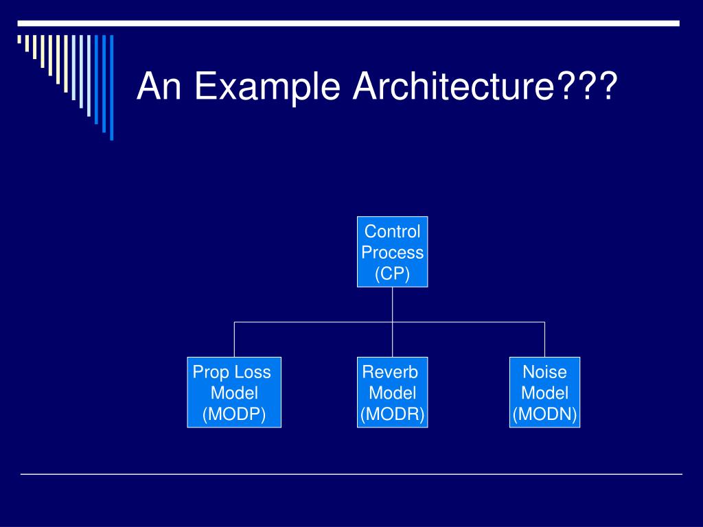 An Example Architecture??? Control Process (CP) Prop Loss Model (MODP) Reverb Model (MODR) Noise Model (MODN)