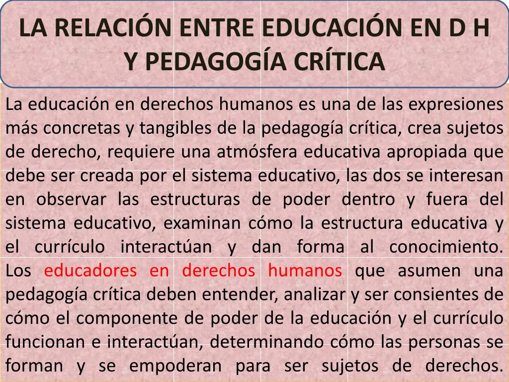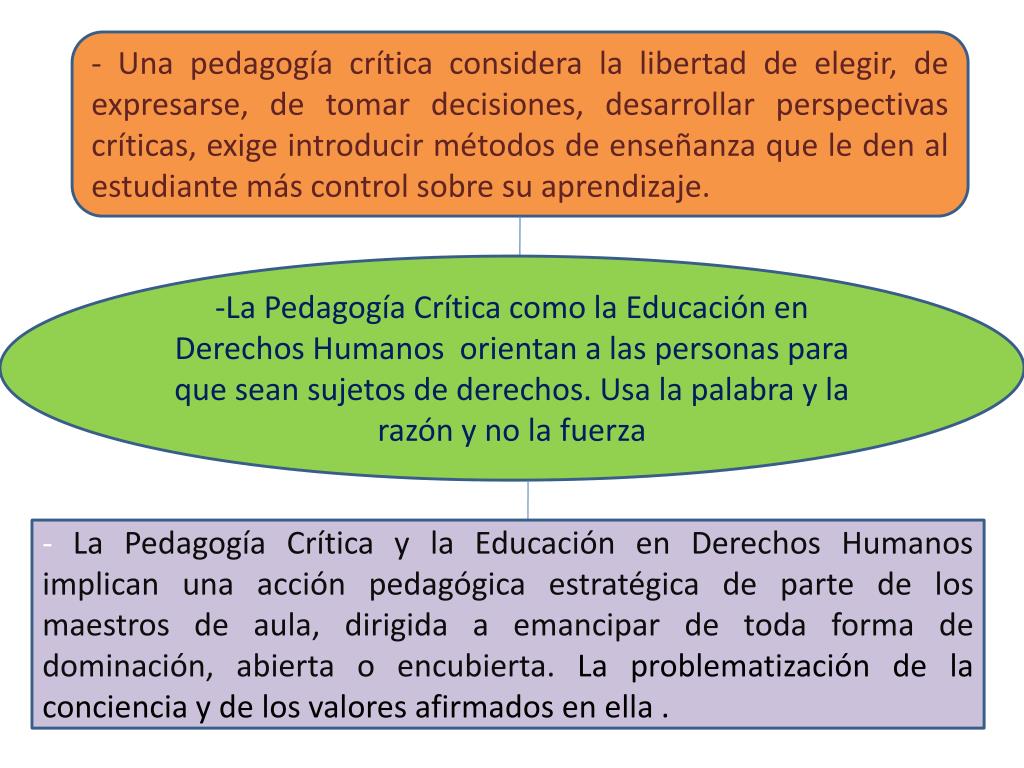 - Una pedagogía crítica considera la libertad de elegir, de expresarse, de tomar decisiones, desarrollar perspectivas críticas, exige introducir métodos de enseñanza que le den al estudiante más control sobre su aprendizaje. -La Pedagogía Crítica como la Educación en Derechos Humanos orientan a las personas para que sean sujetos de derechos. Usa la palabra y la razón y no la fuerza - La Pedagogía Crítica y la Educación en Derechos Humanos implican una acción pedagógica estratégica de parte de los maestros de aula, dirigida a emancipar de toda forma de dominación, abierta o encubierta. La problematización de la conciencia y de los valores afirmados en ella .