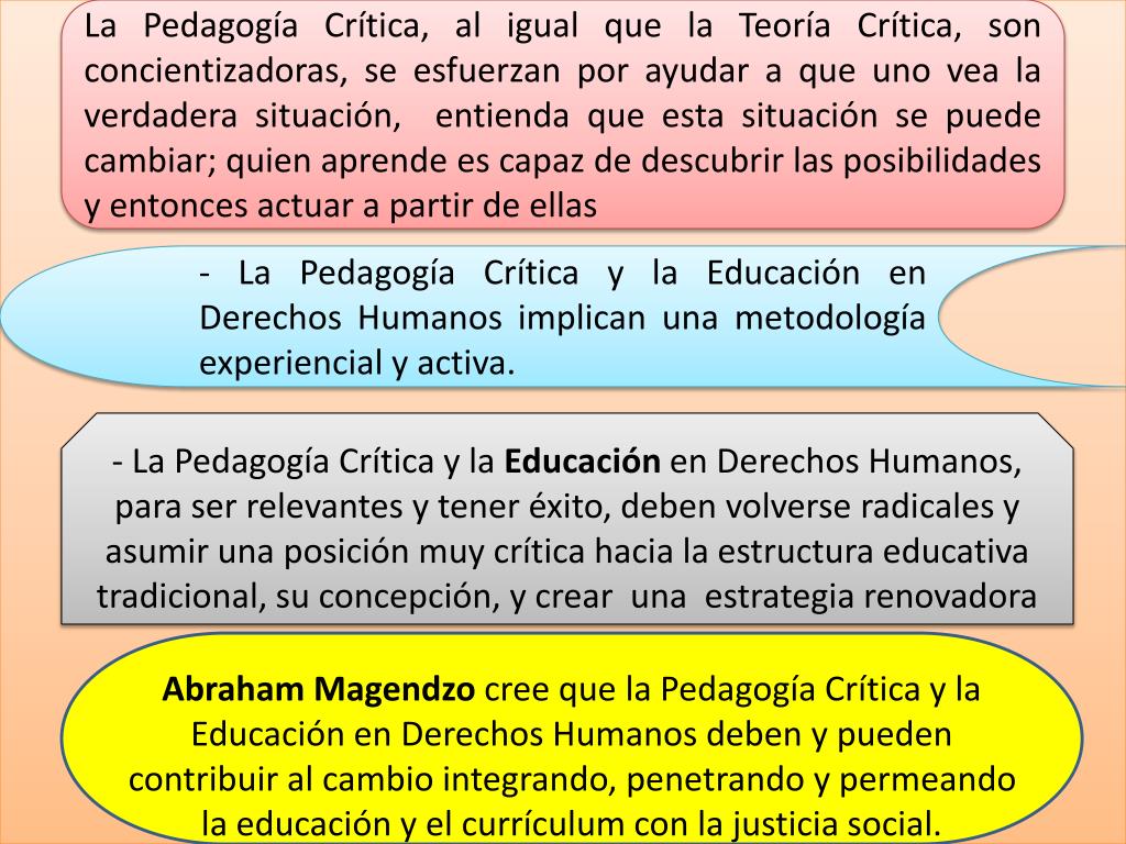La Pedagogía Crítica, al igual que la Teoría Crítica, son concientizadoras, se esfuerzan por ayudar a que uno vea la verdadera situación, entienda que esta situación se puede cambiar; quien aprende es capaz de descubrir las posibilidades y entonces actuar a partir de ellas - La Pedagogía Crítica y la Educación en Derechos Humanos implican una metodología experiencial y activa. - La Pedagogía Crítica y la Educación en Derechos Humanos, para ser relevantes y tener éxito, deben volverse radicales y asumir una posición muy crítica hacia la estructura educativa tradicional, su concepción, y crear una estrategia renovadora Abraham Magendzocree que la Pedagogía Crítica y la Educación en Derechos Humanos deben y pueden contribuir al cambio integrando, penetrando y permeando la educación y el currículum con la justicia social.